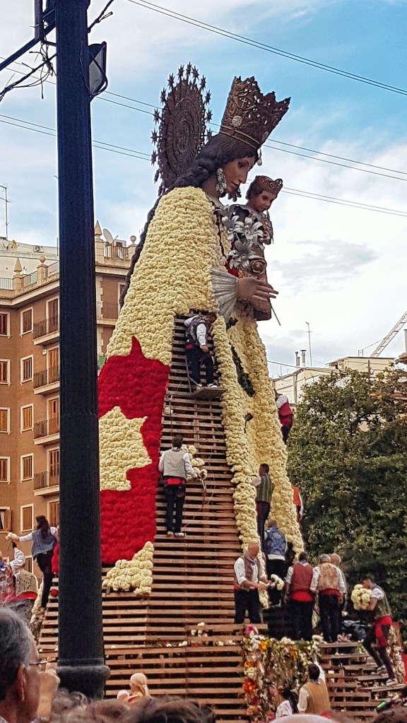 Шествието завършва на Plaza de la Virgen de Valencia, където се строи огромна 10 метрова статуя на La Virgen de los Desamparados (девата на беззащитните) само от бели и червени карамфили. Целият площад мирише на цветя.